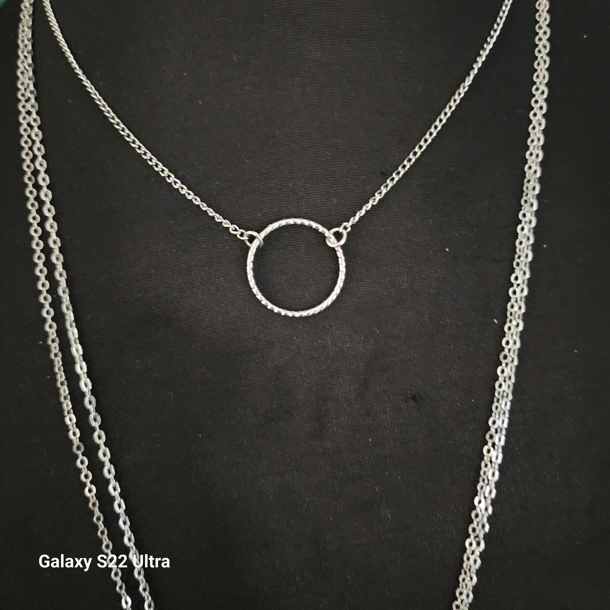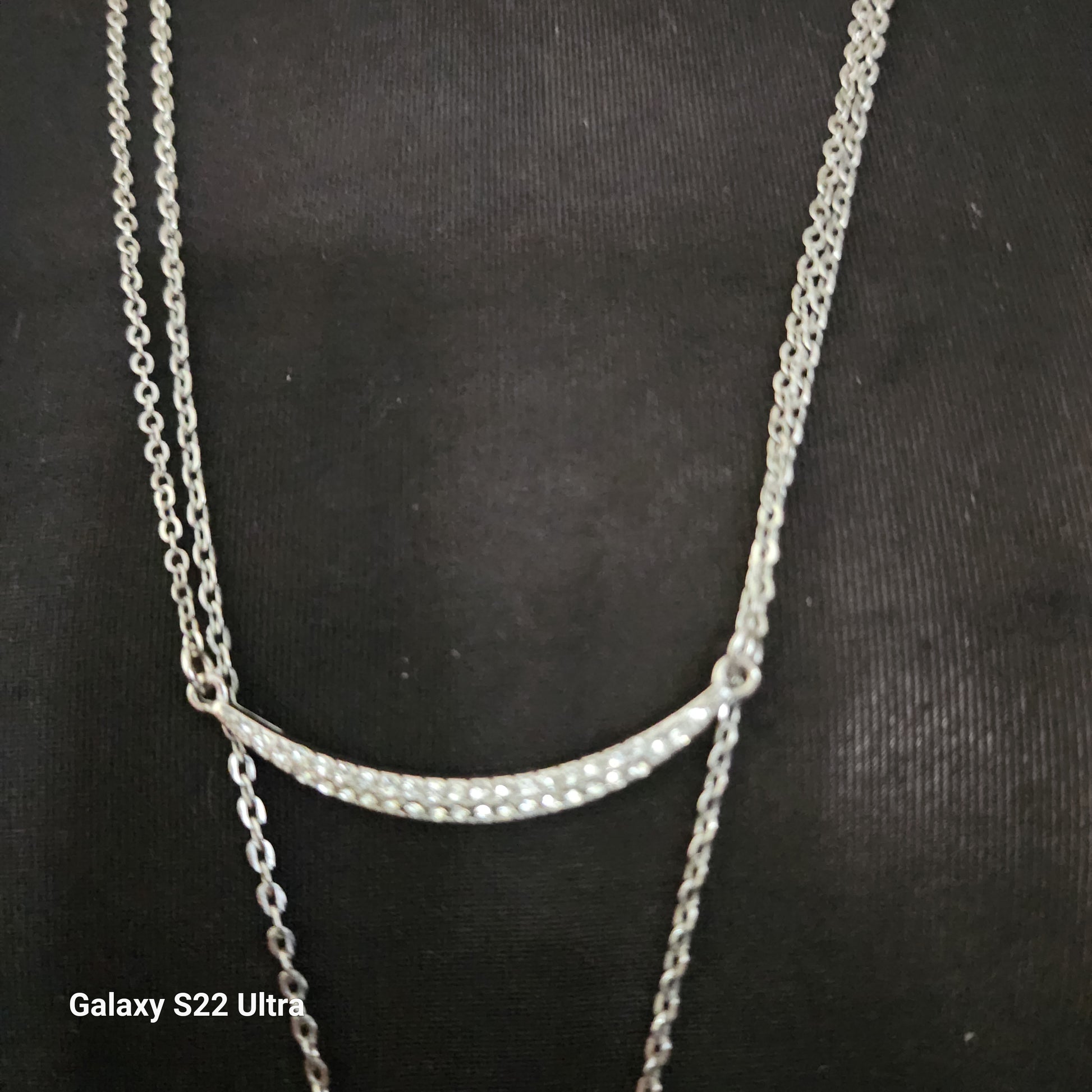 30 inch 3 strand silver tone chain necklace each one with an accent. Long necklace has a rhinestone drop bar very pretty. Pre- owned