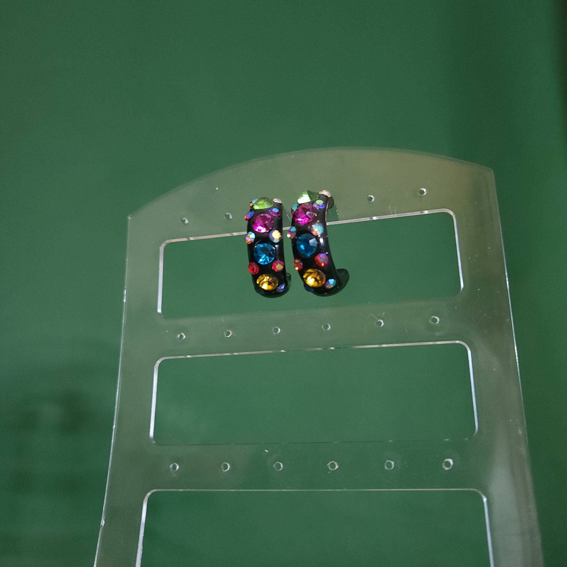 1 inch black acrylic hoop with multicolor glass beads and rhinestone accent . Green, pink,teat andyellow glass beads.
