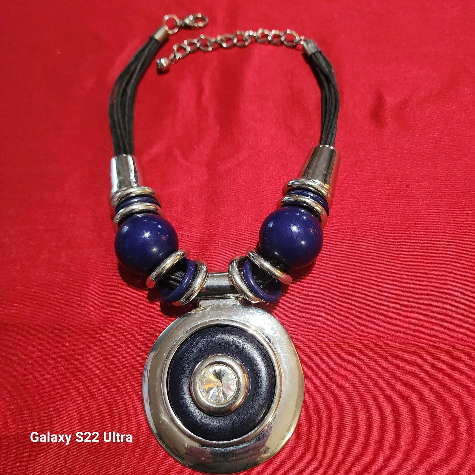 Aprx 22 inch Bulky necklace. In internet shows as a chico design but this piece doesnt have the signature sign. But is very pretty. It has acrylic round bead with black leather strands and a blue leather pendant with clear acrylic accent. Actual necklace on picture. Pre-Owned in good codition