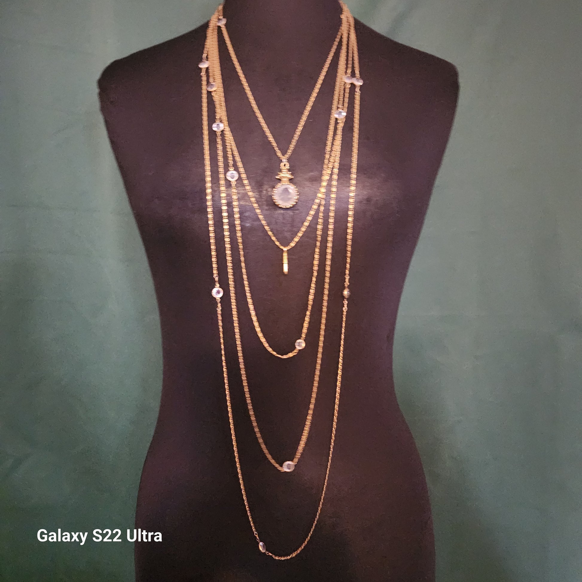 50 inch vintage Goldette necklace with Intaglio cameo pendant, the glass intaglio pendant is clear glass and has the head of a woman. The longest chain is 50 ” and the shortest is 24”. The five chains are attached to a fold over clasp that is signed Goldette. This piece has 14 beveled clear glass crystals in gold bezel settings. The cameo is in good shape. It really is a cool piece cameo has a crack please check before purchasing.