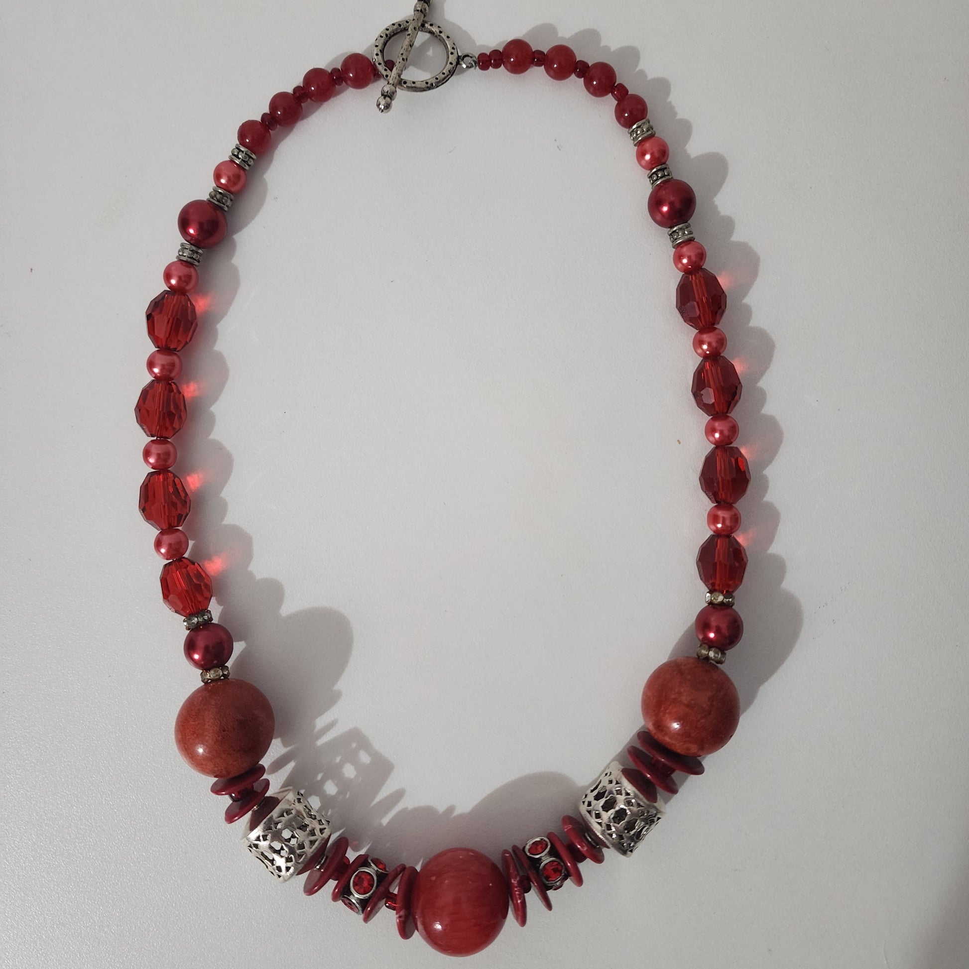 22 inch beautiful statement necklace. This is a red and orange multi-strand beaded fashion necklace featuring red crystal, acrylic, and wood beads, and silver-tone metal accents with red glass facet beads. Pre owned. In good condition